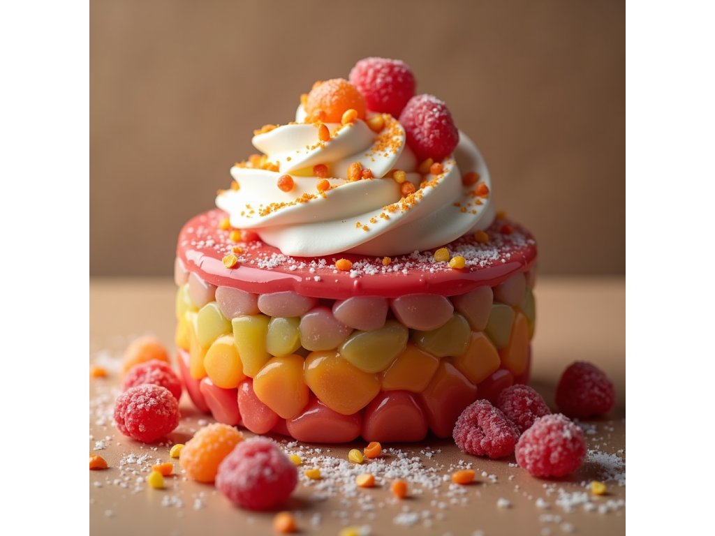 Barevný mini dortík s ovocným želé, malinami a bohatou šlehačkou – sladké potěšení pro každého milovníka originálních dezertů!