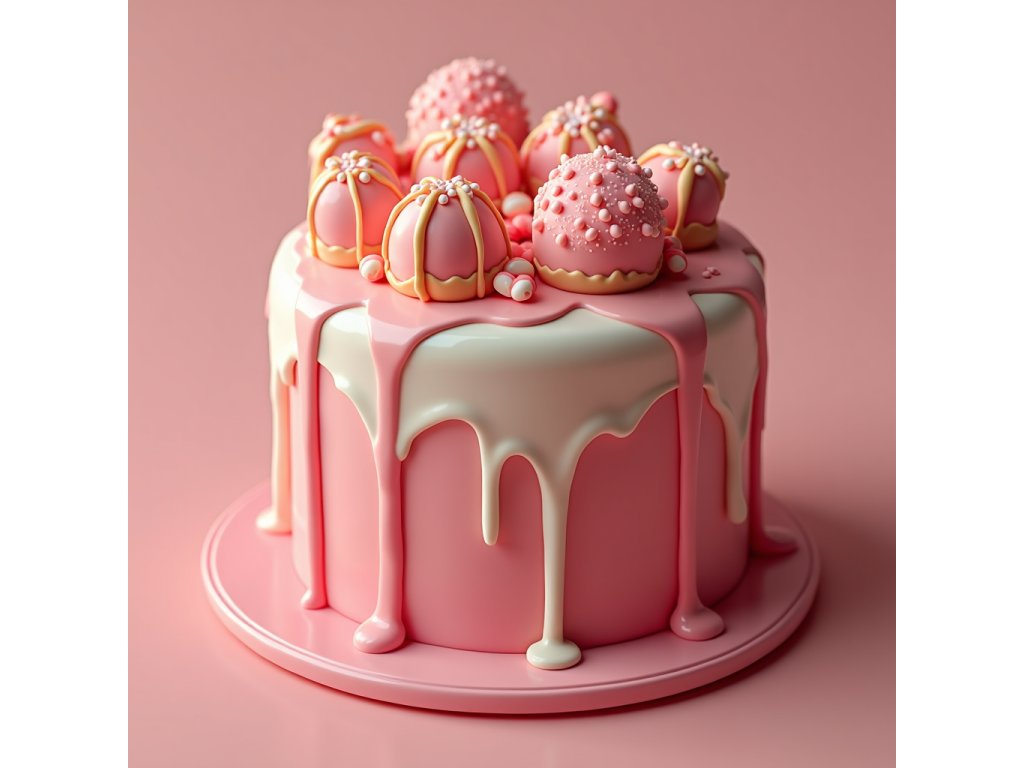 Luxusní růžový dort s bílou čokoládovou polevou a ručně zdobenými pralinkami – pro slavnostní okamžiky, které si zaslouží něco výjimečného.